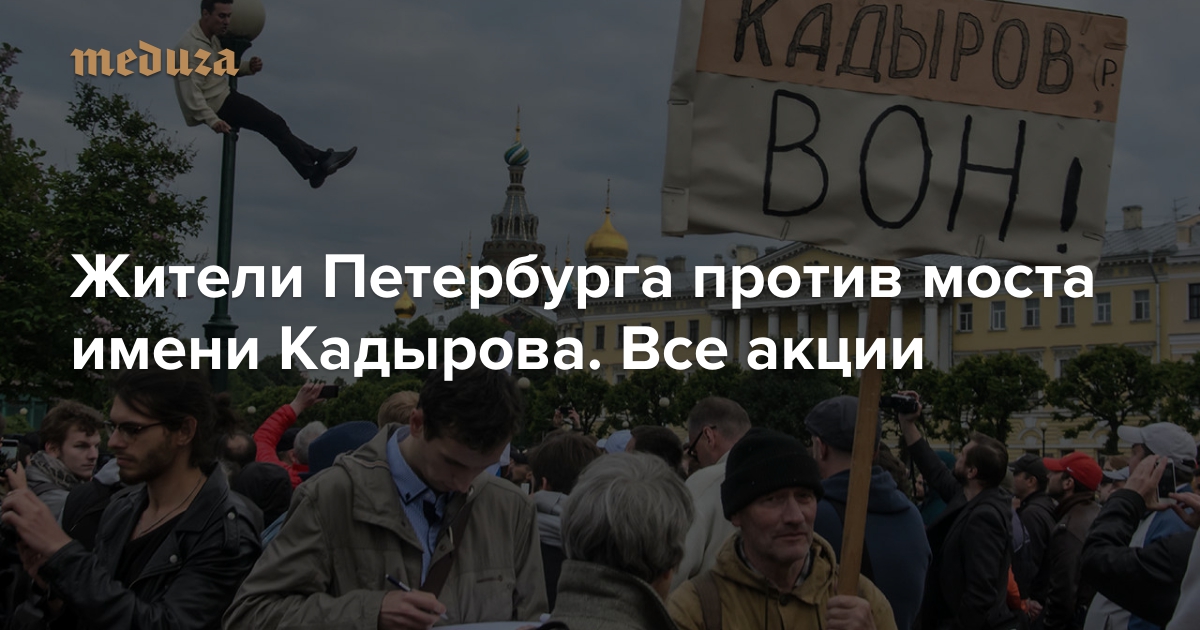 Власти Санкт-Петербурга 16 июня присвоили мосту через Дудергофский канал имя первого президента Чечни Ахмата Кадырова. Многие местные жители (и не только они) были недовольны этим решением: еще в начале июня петербуржцы вышли на митинг, а с тех пор, как мост все-таки получил имя Кадырова, в городе состоялись уже несколько акций протеста. «Медуза» рассказывает, как в Петербурге выступают против моста Кадырова.