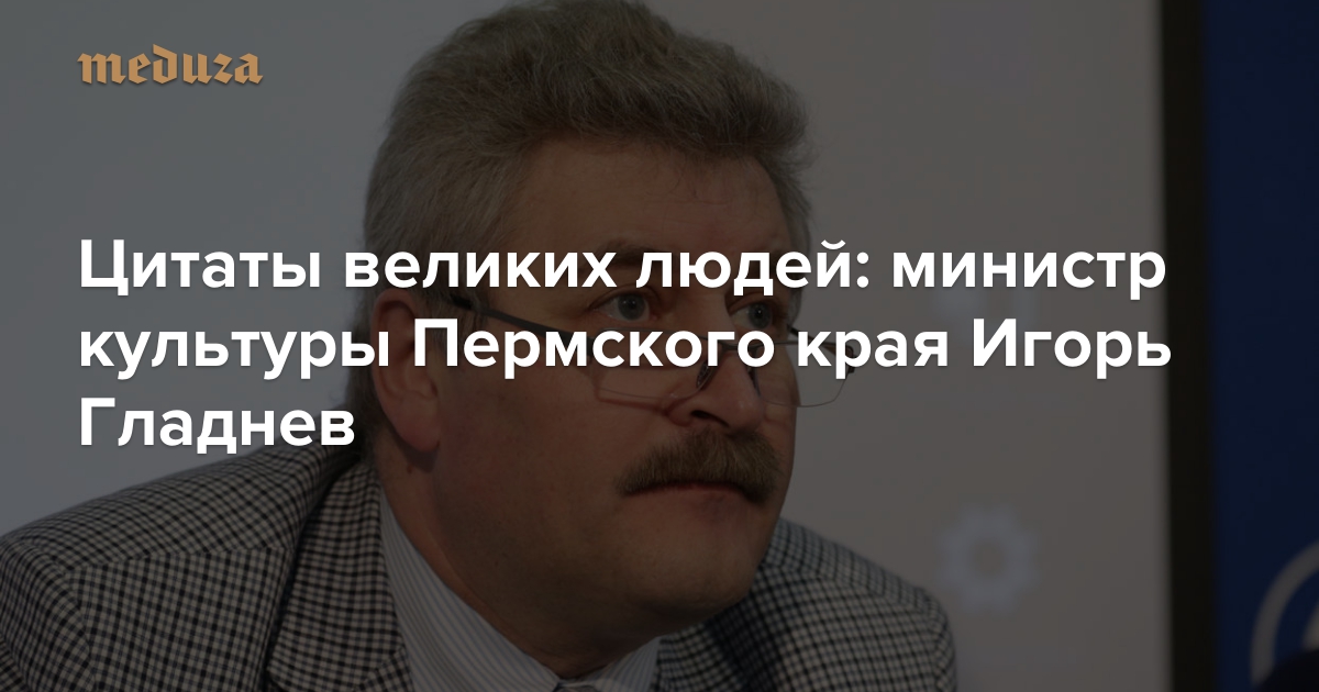 Министр культуры Пермского края Игорь Гладнев 15 июля уволил художественного руководителя пермского Театра-Театра Бориса Мильграма. Увольнение режиссера, лауреата «Золотой маски», спровоцировало скандал в театральном сообществе, за Мильграма вступились актеры театра, многие критики и режиссеры. На фоне этого 20 июля от должности временно отстранили и самого Гладнева, планомерно избавляющегося от наследия «культурной революции» в Перми, главным идеологом которой был директор музея современного искусства PERMM Марат Гельман. Игорь Гладнев помимо прочего известен своими яркими высказываниями о традициях, патриотизме, фестивале по метанию коровьих лепешек и многом другом; «Медуза» выбрала самые интересные цитаты пермского министра культуры.