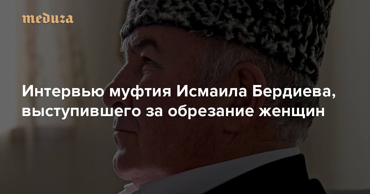 Председатель Координационного центра мусульман Северного Кавказа Исмаил Бердиев 17 августа поддержал практику женского обрезания. «Надо всех женщин обрезать, чтобы разврата не было на Земле, чтобы сексуальность уменьшилась», — заявил муфтий (подробнее об этом читайте тут). Заявление прозвучало вскоре после публикации доклада «Правовой инициативы», посвященного этой процедуре; правозащитники отмечали, что эта практика применяется и в России, в частности в некоторых районах Дагестана. Корреспондентка «Медузы» Саша Сулим поговорила с Исмаилом Бердиевым, который заявил ей, что просто «пошутил».