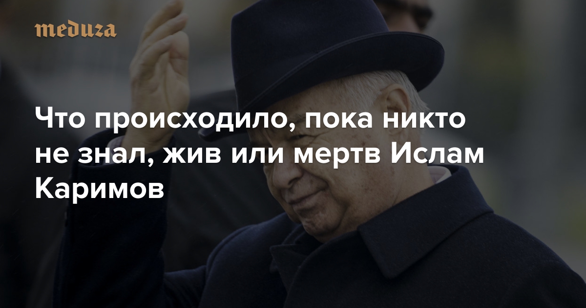 Президент Узбекистана Ислам Каримов 28 августа попал в больницу. На следующий день агентство «Фергана» сообщило о его смерти после перенесенного инсульта. Тем не менее события продолжали развиваться так, будто Каримов все еще жив. Через сайт правительства он поздравил граждан своей страны с Днем независимости и получил поздравления от других президентов. Даже когда Турция выразила соболезнования в связи со смертью Каримова, официальный Узбекистан продолжал молчать. «Медуза» по дням рассказывает, что происходило после того, как бессменный президент Узбекистана попал в больницу.