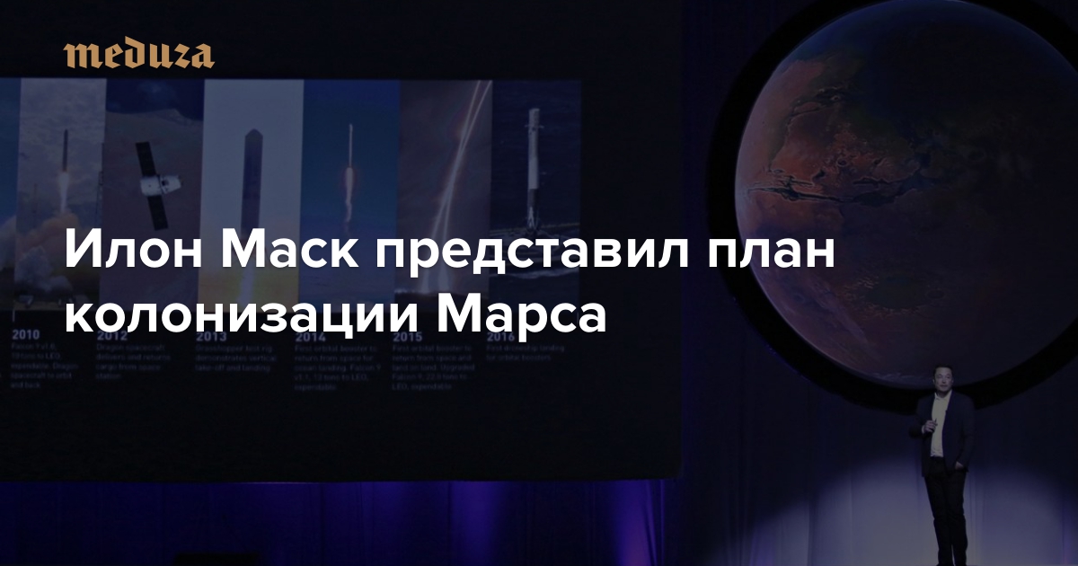 Основатель космической компании SpaceX Илон Маск представил во вторник, 27 сентября, план пилотируемого полета и заселения Марса. Маск утверждает, что первых людей к Марсу можно будет отправить уже в 2024 году, но пока его план далек от реализации — у SpaceX нет ни ракеты, ни космического корабля, способного за 80 дней доставить 100-200 человек к четвертой планете от Солнца. «Медуза» рассказывает, что известно о плане Маска — и с какими проблемами придется столкнуться SpaceX.