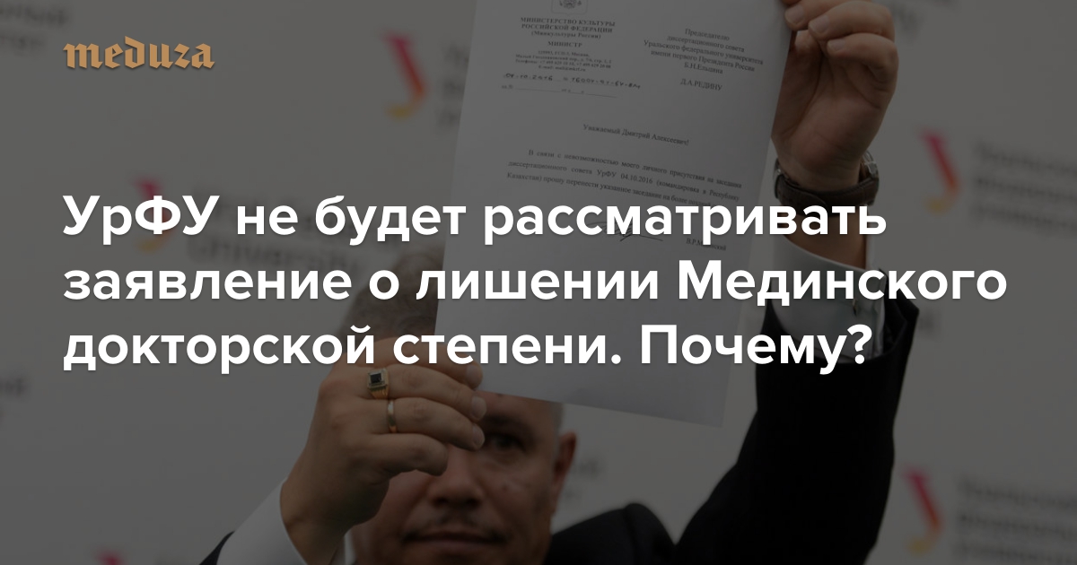 Диссовет в Екатеринбурге собирался посоветовать ВАК лишить Мединского степени, об этом 5 октября написал в своем фейсбуке оппозиционный политик Леонид Волков со ссылкой на «два разных источника». Эти сведения подтверждают источники «Медузы» в УрФУ.
