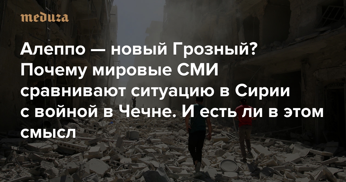 В последние дни на фоне активных бомбардировок в Алеппо зарубежные издания все чаще сравнивают войну в Сирии — и конкретно операцию сирийских и российских военных — с боевыми действиями в Грозном времен второй чеченской войны. Об этом писали «Аль-Джазира», The Economist, Foreign Policy и многие другие издания; 11 октября колонку на эту тему опубликовала The New York Times. «Медуза» рассказывает, почему бомбардировки Алеппо уподобляют чеченской войне — и есть ли на этот счет другие мнения.