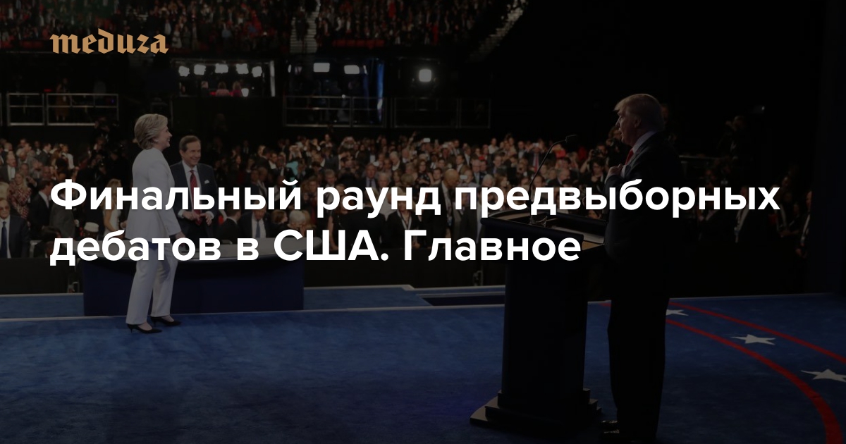В Лас-Вегасе состоялся заключительный раунд предвыборных дебатов кандидатов в президенты США. Хиллари Клинтон и Дональд Трамп использовали последнюю очную встречу перед выборами, чтобы в очередной раз обсудить излюбленные темы: взломанную переписку, стену на границе с Мексикой, российских хакеров и Владимира Путина. «Медуза» рассказывает главное о дебатах — и приводит данные последних прогнозов на предстоящие выборы.