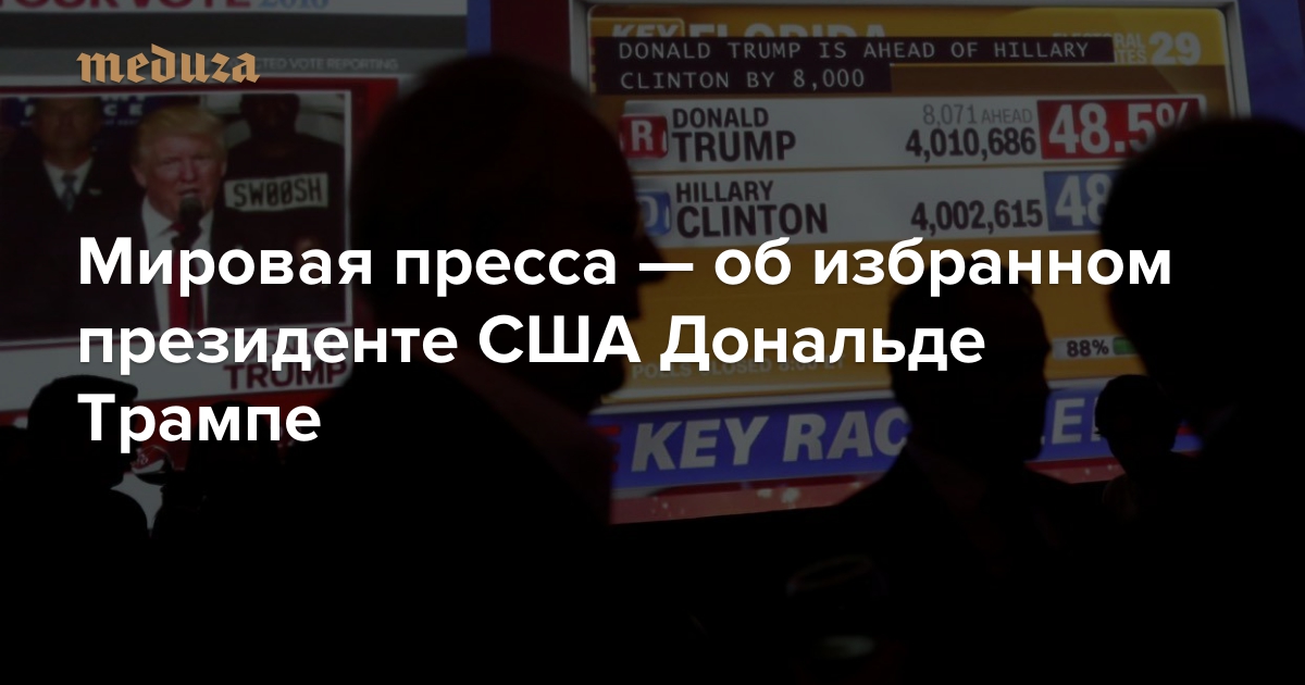 Утром 9 ноября стало известно, что избранным президентом США стал миллиардер Дональд Трамп, которому социологи и аналитики никогда не отводили первое место в гонке. «Медуза» собрала наиболее резонансные колонки в англоязычной прессе, посвященные избранию Трампа.