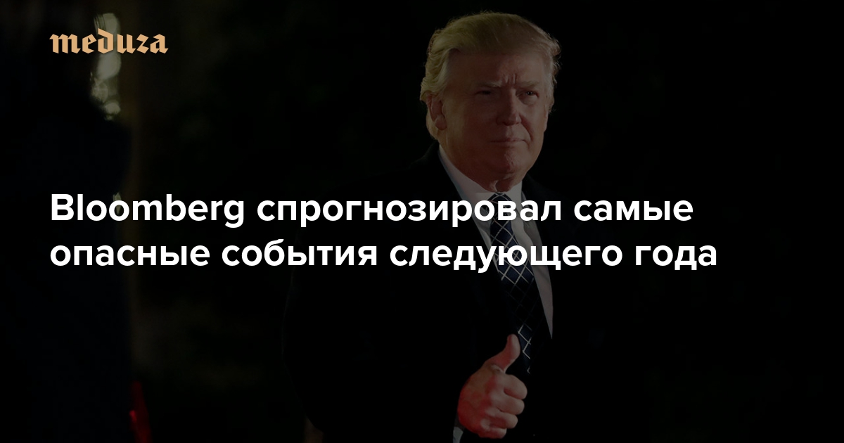 Издание Bloomberg ежегодно составляет рейтинг главных угроз, которые ожидают мир в следующем году. Предсказания Bloomberg довольно часто сбываются: например, в конце 2015-го опрошенные изданием эксперты считали, что в 2016-м стоит бояться избрания Дональда Трампа президентом США и выхода Великобритании из Евросоюза (хотя социологические исследования говорили об обратном). «Медуза» рассказывает, что из прошлогоднего прогноза Bloomberg стало реальностью — и каких событий следует опасаться в 2017 году.