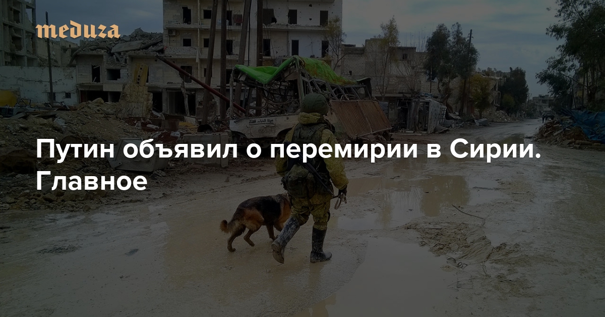 Правительство Сирии и вооруженная оппозиция подписали соглашение о прекращении огня. Об этом заявил президент России Владимир Путин на встрече с министрами иностранных дел и обороны. Группировки оппозиции, которые отказались присоединиться к прекращению огня, будут считаться террористическими. «Медуза» рассказывает главное о перемирии в Сирии.