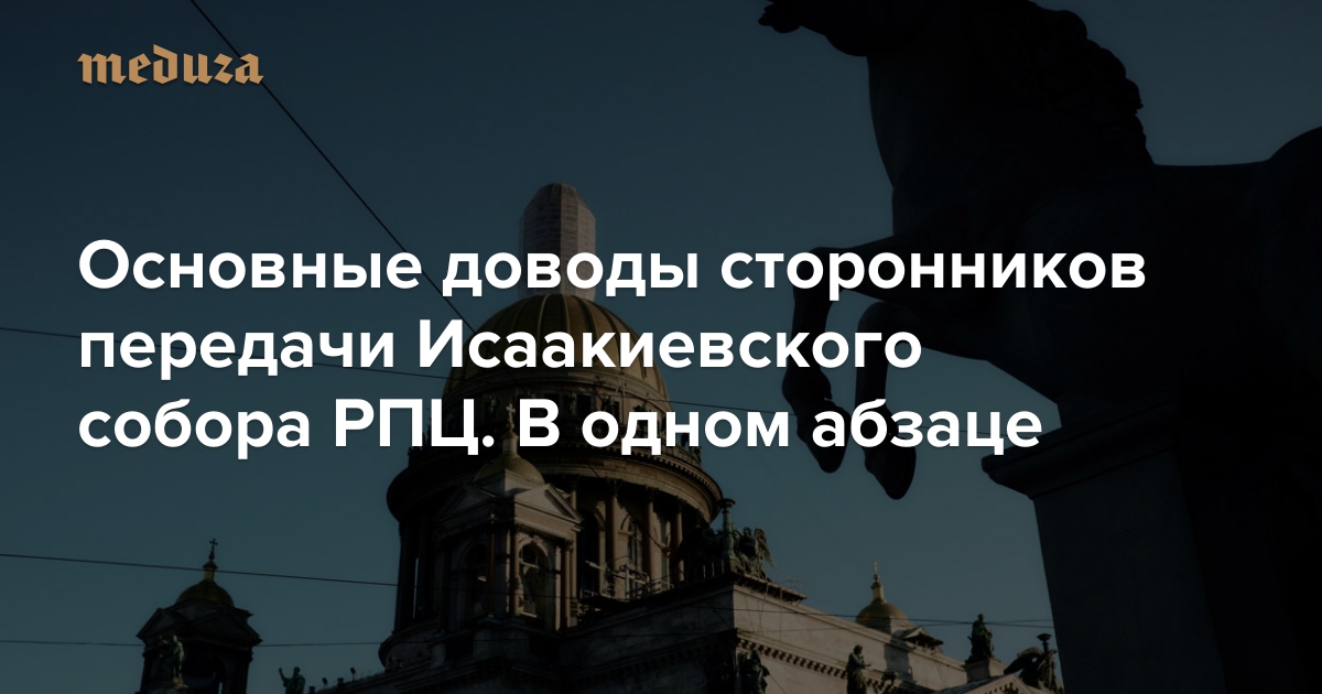 Петицию против передачи Исаакиевского собора в Санкт-Петербурге Русской православной церкви подписали более 200 тысяч человек, около двух тысяч граждан вышли на митинг. Против этого решения высказались представители Союза музеев России, Санкт-Петербургского союза ученых, директор Эрмитажа Михаил Пиотровский и многие другие известные люди и профессиональные организации. Однако пока непохоже, чтобы РПЦ и власти Петербурга отказались от своей идеи. «Медуза» собрала в одном абзаце основные доводы сторонников передачи собора церкви.