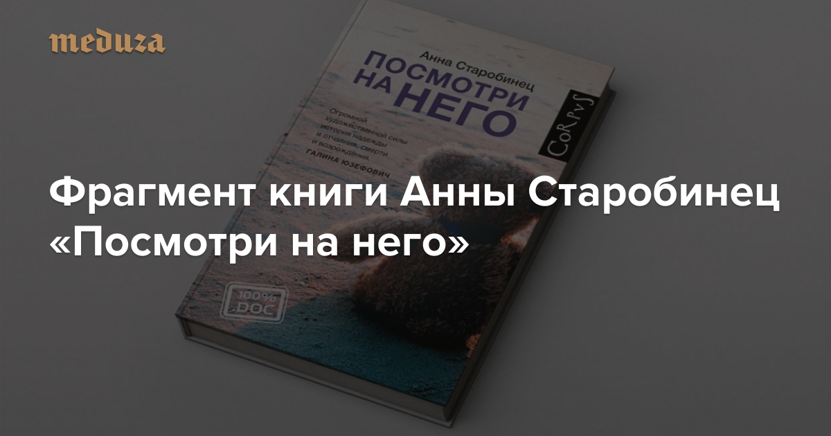 В издательстве Corpus в середине февраля выходит книга Анны Старобинец «Посмотри на него». Это автобиографичная история о патологии плода, необходимости прерывания беременности на позднем сроке и рождении мертвого ребенка. Книга Старобинец — не только документальное свидетельство о российской и западной медицине, но и открытый рассказ о горе, которое принято переживать втайне. С разрешения издательства «Медуза» публикует фрагмент книги.
