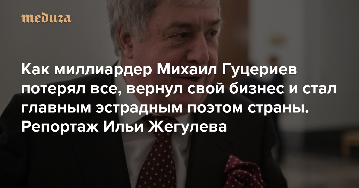 Владелец «Русснефти» и «Бинбанка» Михаил Гуцериев — один из самых удивительных российских крупных предпринимателей. Он едва ли не единственный, кто, потеряв в 2000-х свои активы в борьбе с близкими к государству конкурентами, сумел впоследствии благополучно вернуться из эмиграции, получить свой бизнес назад и приумножить капиталы: даже в кризисные времена Гуцериев постоянно проводит новые сделки и покупает новые компании. Ко всему прочему, в последние годы Гуцериев активно занимается творчеством — к песням на его стихи пишут музыку Виктор Дробыш и Максим Покровский; их поют Стас Михайлов, Алла Пугачева и Валерия; а транслируют эти песни радиостанции, которые самому Гуцериеву и принадлежат. Спецкор «Медузы» Илья Жегулев рассказывает историю Гуцериева.
