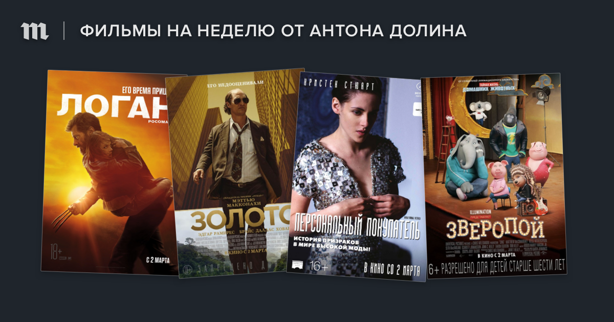 По четвергам на «Медузе» выходят обзоры Антона Долина, посвященные главным кинопремьерам недели. 2 марта в российский прокат выходят «Логан» с Хью Джекманом, «Золото» с Мэттью Макконахи, «Персональный покупатель» с Кристин Стюарт и мультфильм «Зверопой».
