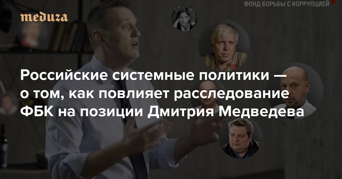 2 марта Фонд борьбы с коррупцией (ФБК) Алексея Навального опубликовал расследование, посвященное «тайной империи» премьер-министра России Дмитрия Медведева. ФБК удалось найти резиденции, особняки, яхты и виноградники, так или иначе связанные с некоммерческими фондами, в руководство которых входят или входили близкие к Дмитрию Медведеву люди. Сотрудники ФБК оценили «объем средств, вращающихся между медведевскими фондами и компаниями», в 70 миллиардов рублей. «Медуза» узнала у системных российских политиков, может ли расследование фонда стать причиной для отставки Медведева.