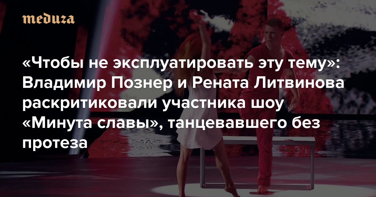 В социальных сетях бурно обсуждают показанный в выходные выпуск шоу «Минута славы» на Первом канале. Причина дебатов — танцевальный номер Алены Щеневой и Евгения Смирнова, брейк-дансера, потерявшего в результате аварии ногу. Резонансным оказалось не только их выступление, но и реакция судей проекта, в первую очередь Владимира Познера и Ренаты Литвиновой. «Медуза» рассказывает, что случилось и в чем проблема с восприятием инвалидности в России.