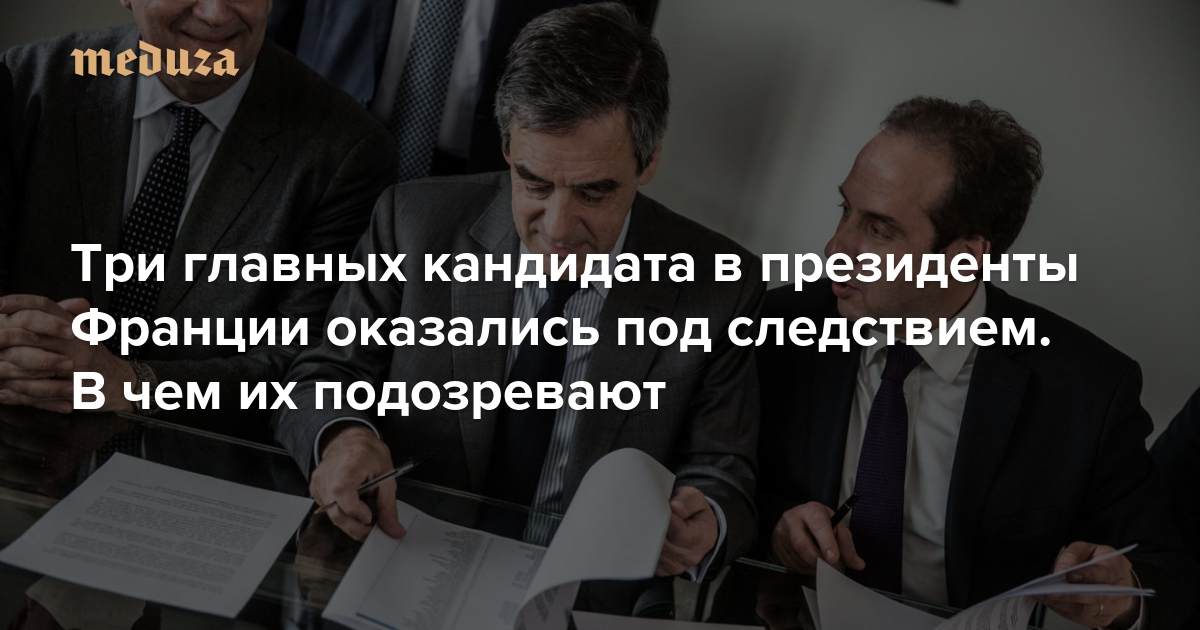 Все трое главных кандидата в президенты Франции накануне апрельских выборов оказались под следствием. Представителя республиканцев Франсуа Фийона подозревают в расходовании государственных денег на зарплату жене, лидера «Национального фронта» Марин Ле Пен — в тратах денег Европейского парламента на сотрудников своей партии, а кандидата от партии «Вперед!» Эммануэля Макрона — в коррупции.