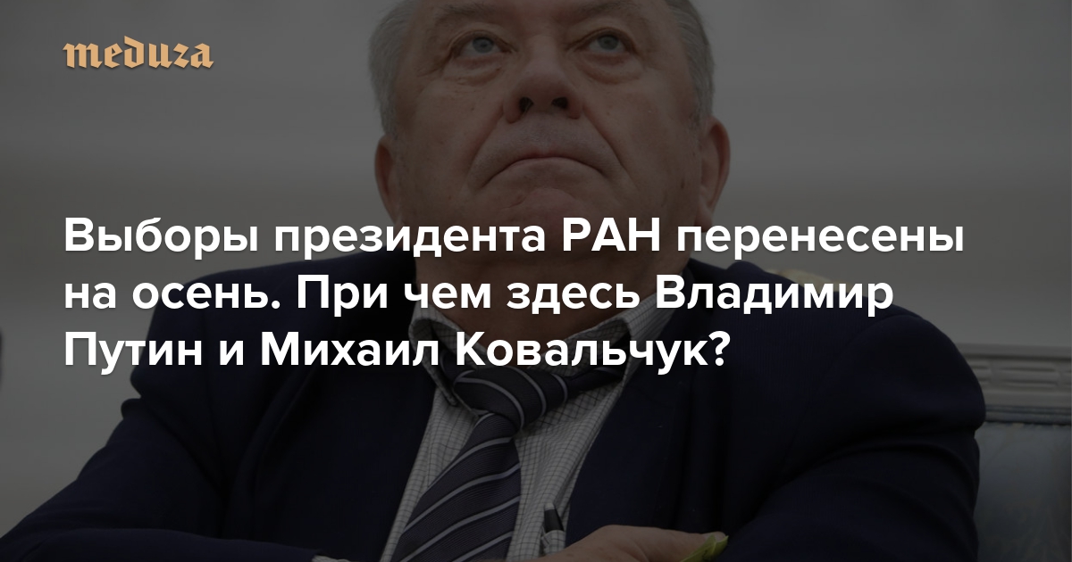 22 марта должны были пройти выборы президента Российской академии наук (РАН), но они отменены, а один из кандидатов — действующий глава РАН Владимир Фортов — лег в больницу на плановый осмотр. Выборы президента РАН были перенесены на осень, после того как Фортов, по словам академиков, встретился с президентом России Владимиром Путиным. По какой схеме пройдут осенние выборы — неизвестно, устав академии может быть изменен. По словам собеседников «Медузы», на пост президента РАН претендует либо президент «Курчатовского института» Михаил Ковальчук, входящий в ближний круг общения Путина, либо его ставленник.
