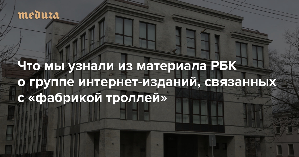 В апрельском номере журнала РБК вышло расследование Андрея Захарова и Полины Русяевой о «фабрике медиа» — группе связанных друг с другом интернет-изданий с совокупной аудиторией более 35 миллионов пользователей в месяц (это больше, чем у «Комсомольской правды» или РИА Новости). «Холдинг», у которого нет единого юридического лица, связан с «фабрикой троллей», писавших провластные комментарии в блогах и на сайтах СМИ, а также, возможно, с бизнесменом Евгением Пригожиным. «Медуза» пересказывает главное из материала журнала РБК.