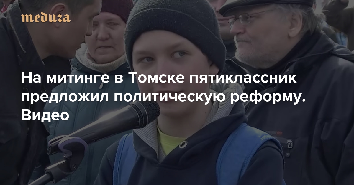 Одним из самых заметных эпизодов митингов протеста, которые прошли 26 марта по всей России, стала речь томского пятиклассника Глеба Токмакова. Выступая на митинге в своем городе, он заявил, что в России необходимо изменить Конституцию и Уголовный кодекс — чтобы законы работали на жителей. «Медуза» публикует видеозапись и расшифровку выступления Токмакова.