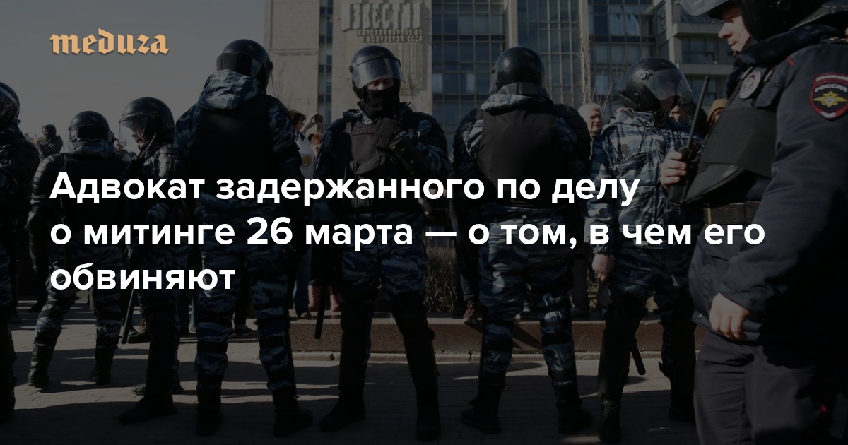 13 апреля Следственный комитет сообщил о задержании четырех мужчин, обвиняемых в «применении насилия в отношении представителя власти» (ст. 318 УК). Следствие считает, что они причастны к нанесению травм полицейским на митинге 26 марта, им может грозить до пяти лет лишения свободы. «Медуза» поговорила с адвокатом одного из задержанных Алексеем Липцером.