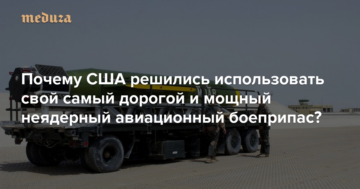 ВВС США 13 апреля 2017 года сбросили на позиции «Исламского государства» в Афганистане «мать всех бомб» — свой самый мощный неядерный авиационный боеприпас GBU-43/B MOAB. Это первое боевое применение такой бомбы — и первое в истории человечества использование столь большого авиационного боеприпаса. На самом деле, особого тактического смысла в использовании «матери всех бомб» против боевиков в Афганистане не было, но на политическом уровне у этого, вероятно, была цель: по мере того, как Северная Корея готовилась к испытанию своей термоядерной бомбы, США совершили несколько вполне однозначных действий. По просьбе «Медузы» о «матери всех бомб» рассказывает военный эксперт Василий Сычев.