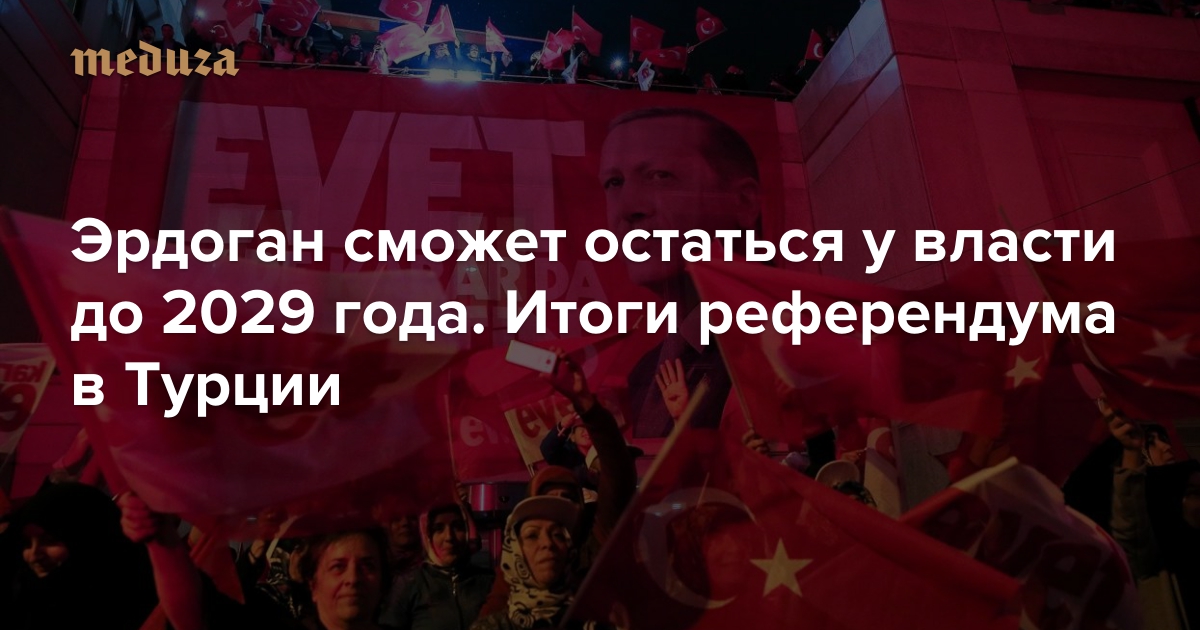 В Турции 16 апреля прошел референдум о существенном расширении полномочий президента страны, инициированный после попытки государственного переворота летом 2016 года. Официальные результаты референдума еще не оглашены, но предварительные данные свидетельствуют, что реформу Эрдогана одобрили 51,4% избирателей. Президент Турции уже объявил о своей победе; оппозиция утверждает, что результаты были сфальсифицированы, а противникам референдума не давали возможность агитировать против реформ. «Медуза» рассказывает, как проходил референдум и что теперь изменится в Турции.