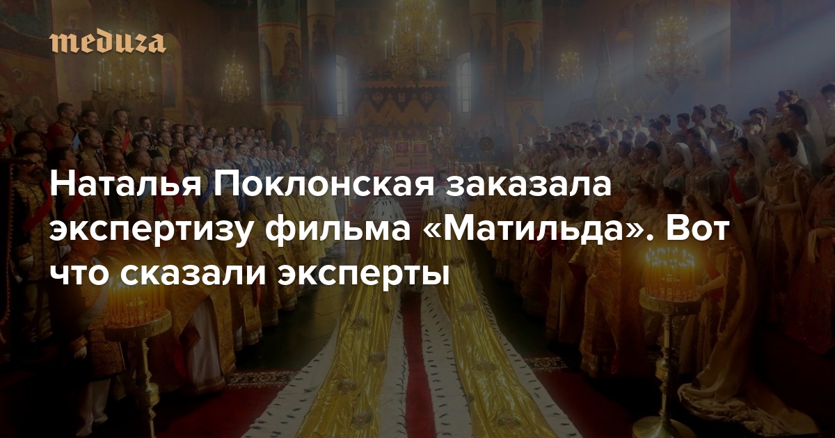 Депутат Госдумы Наталья Поклонская, у которой особое отношение к императору Николаю II, продолжает бороться с фильмом Алексея Учителя «Матильда», где рассказывается об отношениях монарха с балериной. После обращений в Генпрокуратуру она решила сама заказать экспертизу фильма. Сотрудник Института мировой литературы, член-корреспондент Российской академии образования, профессор из Московского лингвистического института и доктор юридических наук изучили два трейлера «Матильды», прочитали сценарий и пришли к выводу, что показывать такой фильм нельзя — он оскорбляет чувства православных. Полный текст экспертизы занимает 39 страниц; «Медуза» коротко его пересказывает.