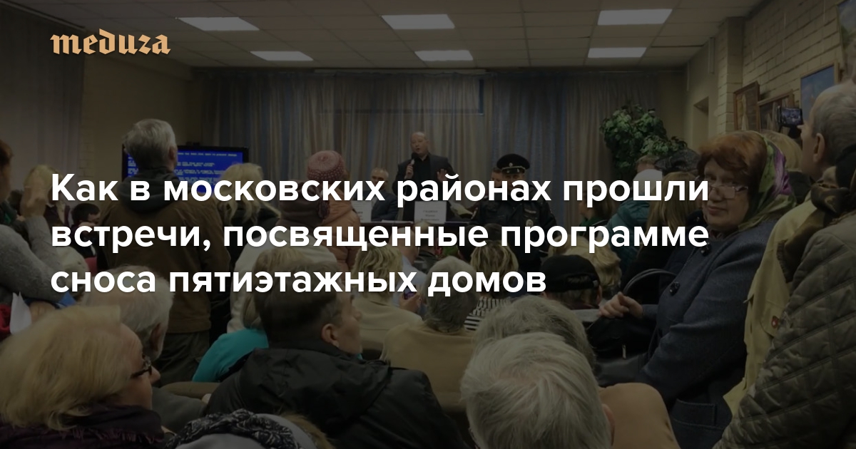 20 апреля Госдума приняла в первом чтении законопроект о реновации — сносе большинства московских пятиэтажек и переселении их жителей в новые дома. По словам мэра Москвы Сергея Собянина, вопрос о сносе каждого квартала будет приниматься большинством голосов жителей, голосование власти намерены проводить через приложение «Активный гражданин»; несогласных с решением большинства выселят через суд. 19 апреля во всех районах Москвы состоялись встречи жителей с руководителями управ, на которых обсуждали реализацию еще не принятого закона; встречи проходили с аншлагом. «Медуза» опросила жителей нескольких районов и узнала, как проходили собрания и сколько людей поддерживают одну из самых масштабных столичных программ.