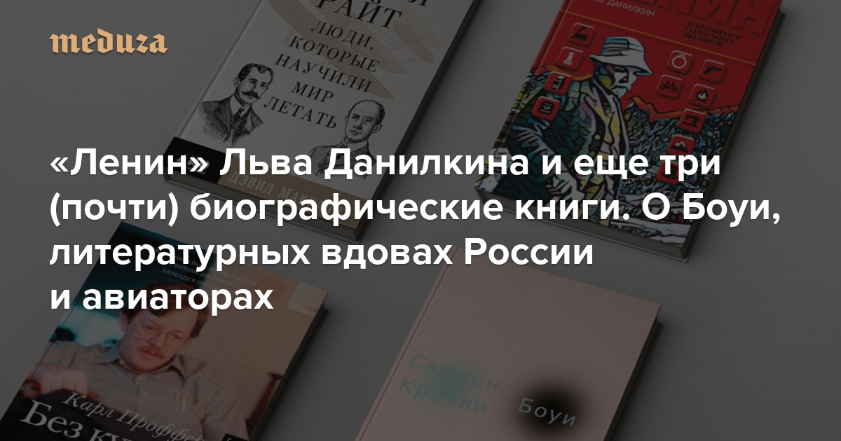 Литературный критик «Медузы» Галина Юзефович рассказывает о книге Льва Данилкина «Ленин: Пантократор солнечных пылинок» и еще о трех важных книгах, посвященных известным персонажам: «Боуи» Саймона Кричли, «Без купюр» Карла Проффера о литературных вдовах России и «Братья Райт: Люди, научившие мир летать» Дэвида Маккалоу.