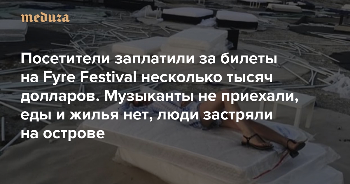 В декабре 2016 года был анонсирован Fyre — музыкальный фестиваль, который должен был пройти в конце апреля-начале мая на одном из Багамских островов. Фестиваль рекламировали инстаграм-модели, выступить там должны были Major Lazer и Blink-182, билеты стоили по несколько тысяч долларов. Когда посетители смогли не без труда добраться до места проведения фестиваля, выяснилось, что там нет ни музыкантов, ни жилья, ни еды. «Медуза» рассказывает эту удивительную историю.
