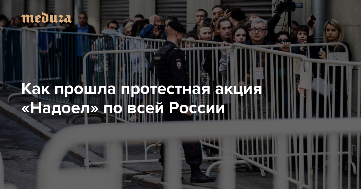 29 апреля по всей России прошла протестная акция «Надоел», объявленная Михаилом Ходорковским и «Открытой Россией». Она получилась не слишком многочисленной — и протекала относительно мирно: полиция задерживала людей только в нескольких городах, наиболее массово — в Санкт-Петербурге. «Медуза» кратко рассказывает о том, как проходила акция в городах РФ.