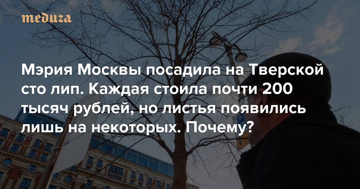 В начале мая 2017 года пользователи соцсетей обратили внимание, что деревья, высаженные в центре Москвы в ноябре 2016-го, так и не пустили свежие побеги. В том числе и 97 лип на Тверской улице; каждая обошлась бюджету в 191 тысячу рублей. Граждане обвиняют в происходящем городские службы — растения сажали почти зимой, в холод и снегопад; при этом ноябрь считается подходящим месяцем для посадки деревьев. «Медуза» исследовала состояние деревьев в центре столицы и выяснила у чиновников и специалистов, почему деревья никак не зазеленеют.