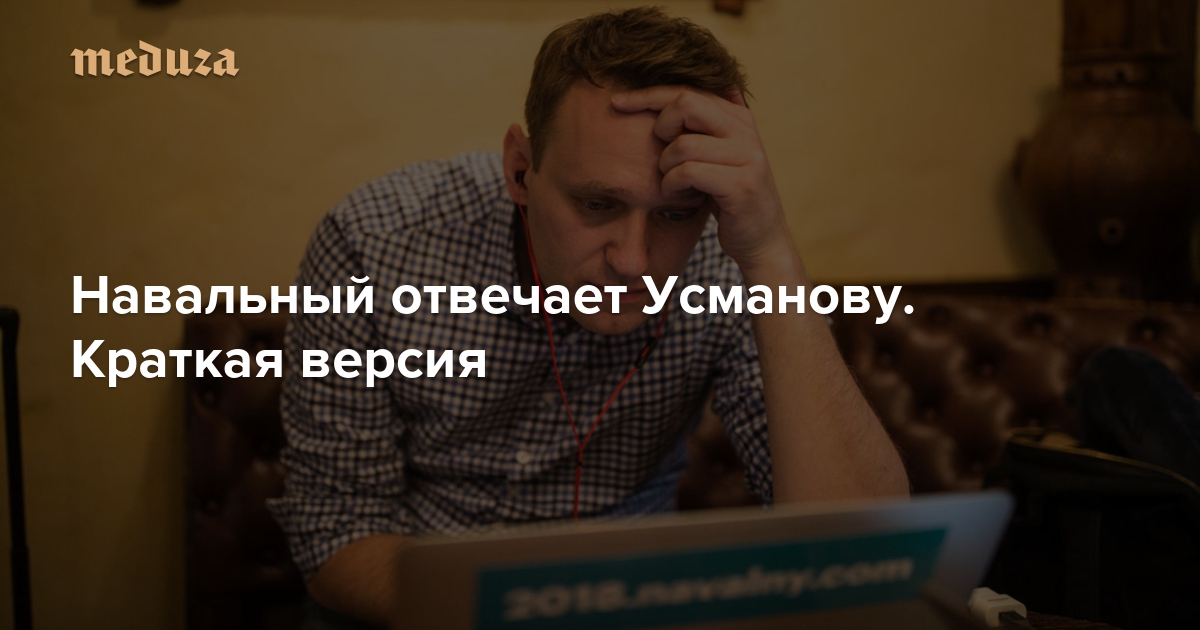 Оппозиционер Алексей Навальный и бизнесмен Алишер Усманов продолжают обмениваться видеообращениями; одновременно предприниматель доказывает в суде, что не давал взятку премьеру Дмитрию Медведеву. В своих обращениях Усманов настаивал, что заработал свои деньги честно и никогда не участвовал в приватизации. Навальный по пунктам ответил Усманову, «Медуза» коротко пересказывает последнее заявление политика.
