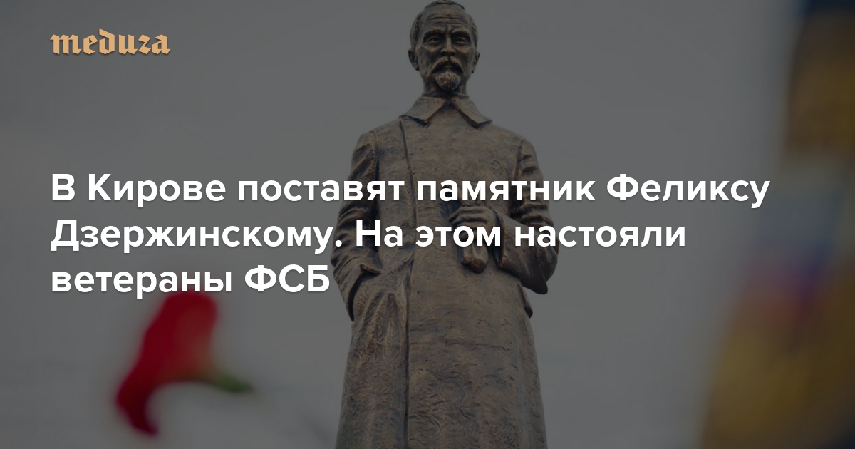 Кировская городская дума большинством голосов проголосовала за установку в центре города памятника создателю ВЧК Феликсу Дзержинскому. Памятник поставят по инициативе кировских ветеранов ФСБ и за счет спонсорских средств. Ветераны настаивают, что Дзержинский, который ввел в обиход словосочетание «красный террор», заслужил памятник, потому что «вся его жизнь была пронизана борьбой за светлое будущее человечества». «Медуза» рассказывает, как кировские депутаты приняли это решение.