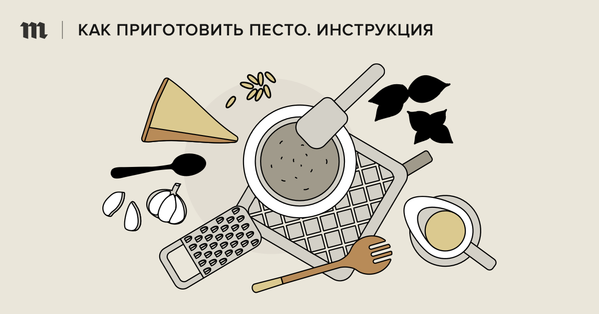 Название «песто» восходит к глаголу pestâ из генуэзского диалекта — дословно он означает «толочь, растирать в ступке». Именно так и положено готовить соус: выложить все твердые ингредиенты в мраморную ступку и растереть их круговыми движениями, постепенно добавляя оливковое масло. В результате должна получиться густая паста с едва ощутимой крупчатой текстурой.