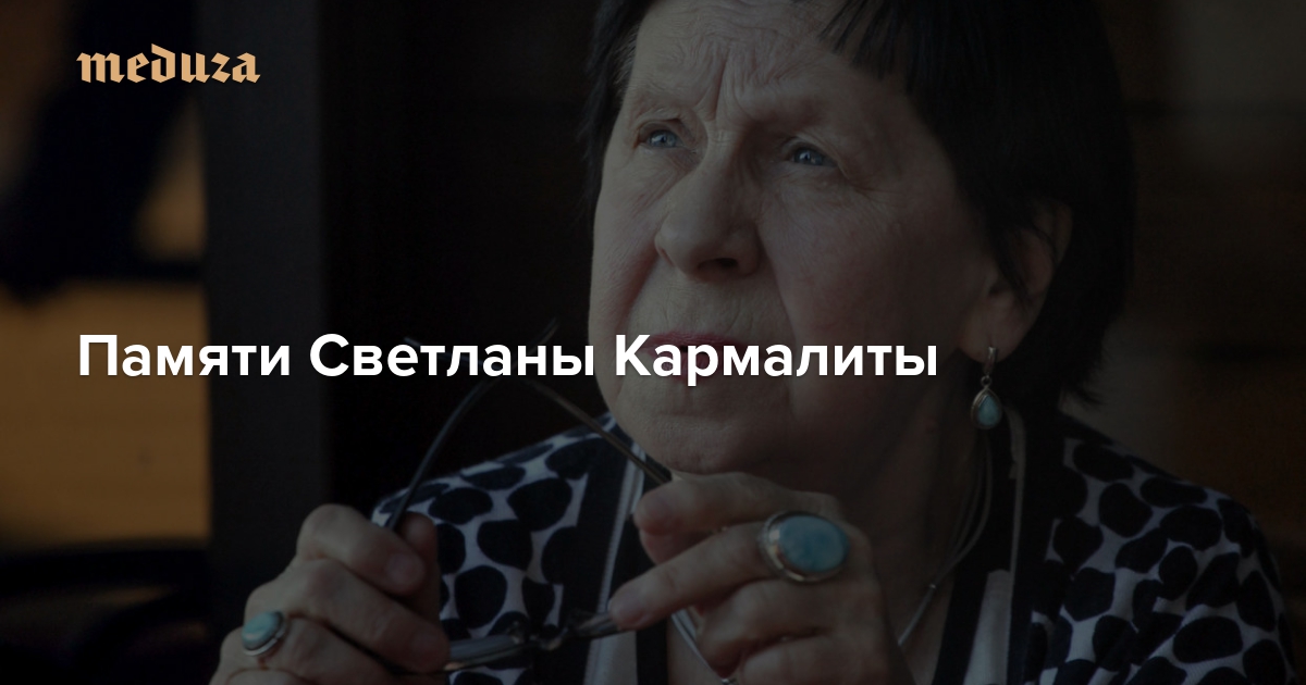Уход Светланы Кармалиты — огромная потеря; но не сразу и поймешь, как объяснить ее масштаб несведущему. Если верить биографиям, Кармалита — сценарист нескольких картин, среди которых как минимум одна значительная — «Торпедоносцы» Семена Арановича (1983) — и две великие: последние фильмы Алексея Германа «Хрусталев, машину!» (1998) и «Трудно быть богом» (2013). В основном же писать будут, конечно, не об этом. Кармалита — жена Германа, его соратница и соавтор.