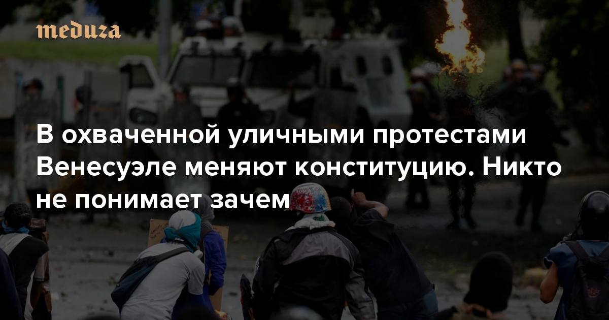 Николас Мадуро, чтобы «вернуть мир» в свою страну, решил созвать учредительное собрание. Это специальный орган, который созывается для изменения конституции. В конце 1990-х учредительное собрание созывал Уго Чавес; в итоге была написана действующая конституция. Зачем ее менять спустя без малого 20 лет, никто не понимает, а Николас Мадуро никак это публично не объяснил. Как учредительное собрание может помочь вернуть продукты в магазины, он тоже не объясняет.