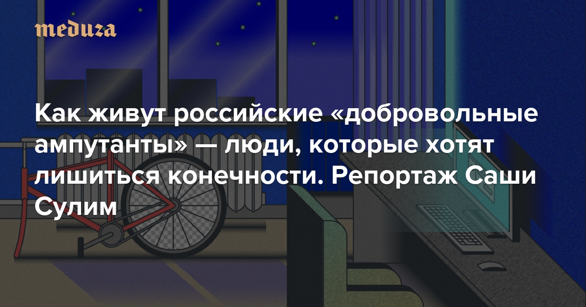 Существующий в западной медицине термин «синдром нарушения целостности восприятия собственного тела» (Body integrity identity disorder или BIID) описывает людей, которые хотят избавиться от своих конечностей, — их еще называют добровольными ампутантами. Те, у кого наблюдается такое расстройство, воспринимают конечность как чужеродный объект; ампутация для них — способ почувствовать себя «целыми»; часто эти люди целенаправленно наносят себе вред, чтобы избавиться от ноги или руки. Ученые начали исследовать BIID только в последние 15 лет и только в западных странах — однако добровольные ампутанты есть и в России, где эта проблема никак не изучается. О том, как устроена их жизнь, рассказывает корреспондент «Медузы» Саша Сулим. Аудиоверсия текста.