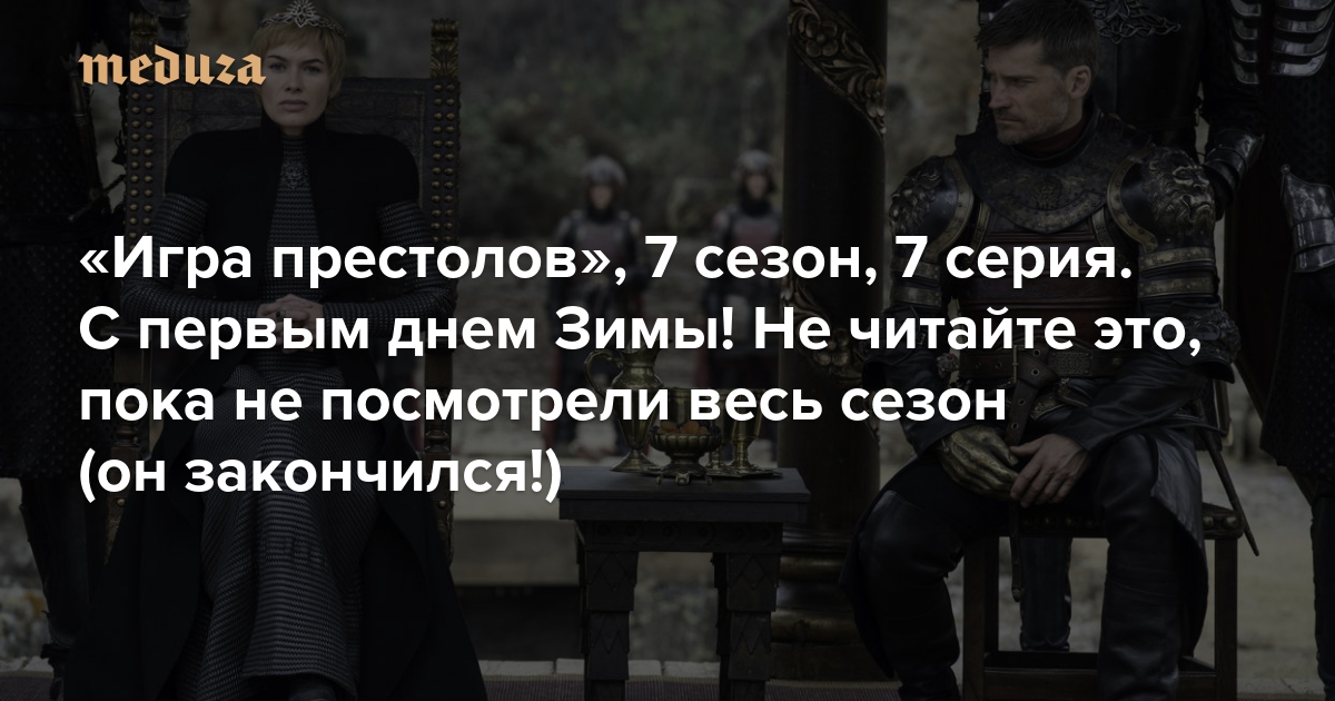 На канале HBO и в российской «Амедиатеке» завершился 7 сезон «Игры престолов». «Медуза» посмотрела финальную серию и рассказывает, что же там произошло. А также осторожно размышляет о том, что нас ждет впереди. Внимание: если вы не смотрели седьмую серию, лучше закройте этот материал!