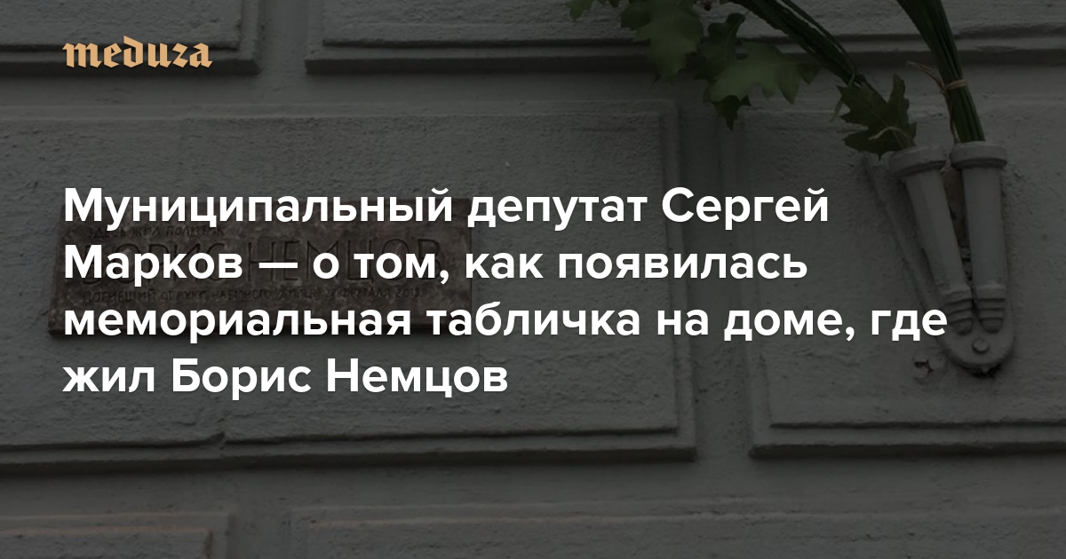 7 сентября в Москве на доме по адресу Малая Ордынка, 3, торжественно открыли мемориальную табличку памяти убитого в феврале 2015 года политика Бориса Немцова, который жил в этом доме. Создали табличку архитектор Евгений Асс и дизайнер Евгений Добровинский, а установили ее по решению собрания собственников жилья. Инициатором установки таблички был муниципальный депутат района Замоскворечье Сергей Марков. «Медуза» поговорила с Марковым.