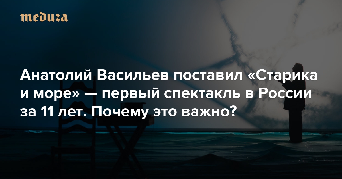 Основатель театра «Школа Драматического искусства» режиссер Анатолий Васильев с 2006 года живет во Франции и не работает в России, но этим летом он сделал исключение для Чеховского фестиваля и поставил спектакль «Старик и море» по повести Хэмингуэя на сцене театра имени Вахтангова. Сыграли спектакль всего дважды, еще два показа пройдут 30 сентября и 1 октября. По просьбе «Медузы» театральный критик Антон Хитров рассказывает, каким получилось возвращение Васильева на русскую сцену, из чего складывается новый спектакль и почему его непременно стоит увидеть.