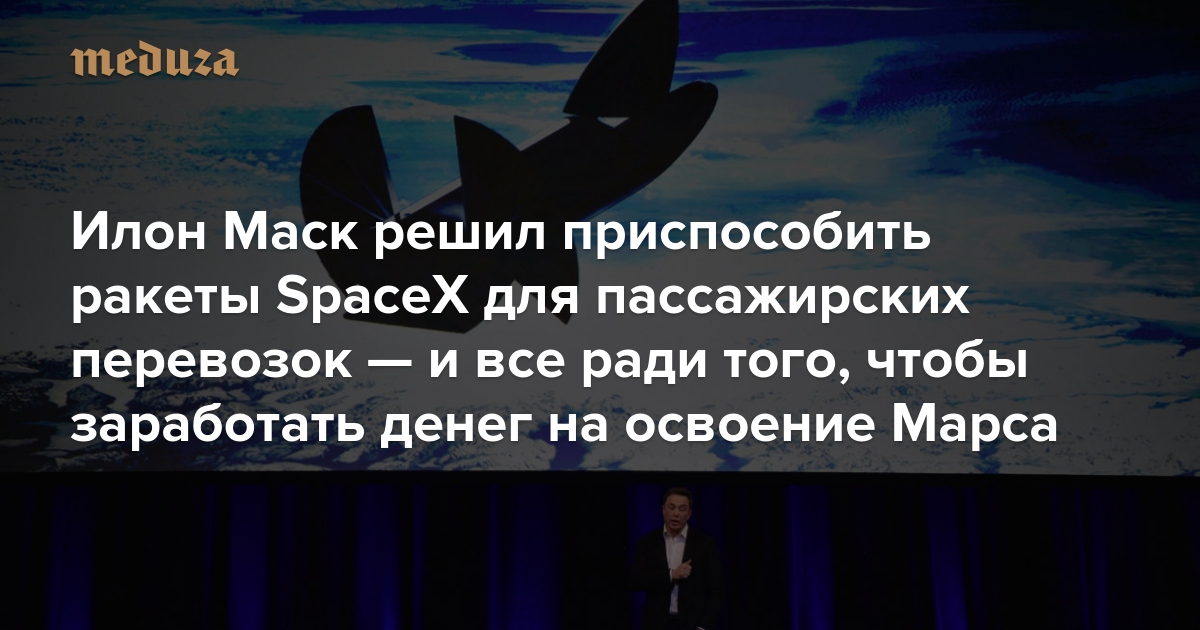 Основатель SpaceX Илон Маск 29 сентября представил на Международном космическом конгрессе в Австралии стратегию развития компании — и одновременно свое видение будущего космической индустрии в целом. Маск по-прежнему мечтает о Марсе и готов направить все усилия для колонизации этой планеты — но, помимо этого, он обещает разработать новый вид дешевого транспорта, который сможет преодолевать расстояние от Нью-Йорка до Лондона за полчаса. «Медуза» рассказывает, что обещает Маск и насколько это реально.