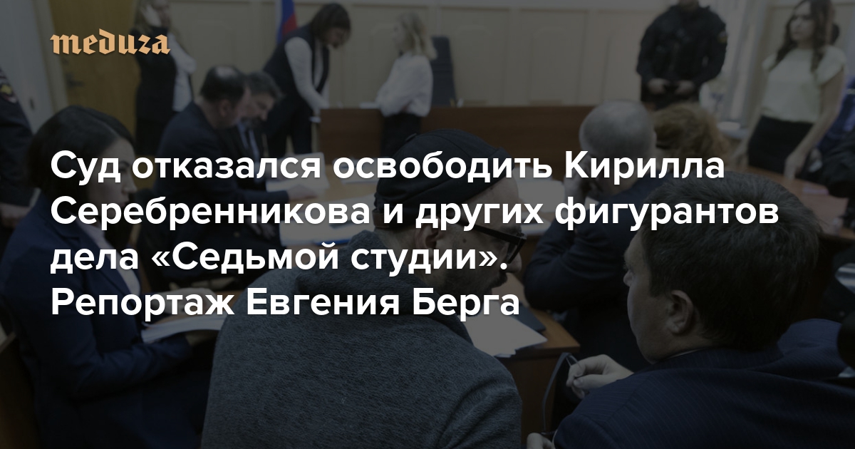 Во вторник, 17 октября, Басманный суд Москвы продлил меру пресечения фигурантам дела «Седьмой студии». Режиссер Кирилл Серебренников, бывший гендиректор компании Юрий Итин и бывший ее главный бухгалтер Нина Масляева остались под домашним арестом; бывший гендиректор «Гоголь-центра» Алексей Малобродский останется в СИЗО; все — до 19 января. Серебренников просил смягчить ему меру пресечения, чтобы дать закончить съемки фильма «Лето» про Виктора Цоя и подготовку балета «Нуреев». Судья Артур Карпов, хоть фильмом и заинтересовался, меру пресечения не изменил. В суде был журналист «Медузы» Евгений Берг.