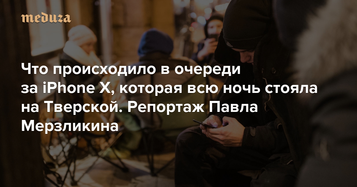 Утром 3 ноября в России открылись продажи iPhone X. В Москве запись в очередь за новым телефоном стоимостью от 80 до 92 тысяч рублей началась примерно за неделю до старта продаж. Первые потенциальные покупатели пришли к магазину на Тверской почти за трое суток и все это время практически не отходили от магазина. Ночью 3 ноября в очереди начались стычки за места, самые отчаянные пытались миновать толпу, приведя родственников — ветеранов Великой Отечественной. За тем, что происходило на Тверской накануне старта продаж, наблюдал корреспондент «Медузы» Павел Мерзликин.