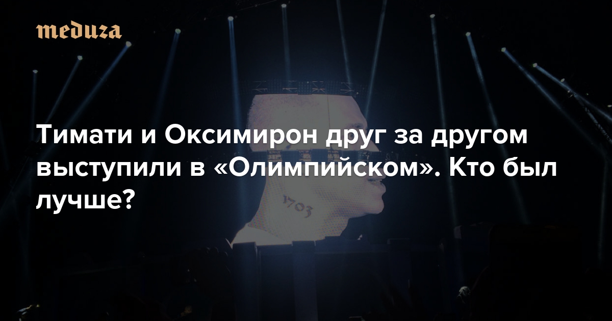 С разницей в день в «Олимпийском» — на одной из главных концертных площадок страны, традиционно имеющей для музыкантов важное символическое значение, — сыграли аншлаговые концерты два больших русских рэпера, Тимати и Оксимирон. Рассудив, что более непохожих друг на друга людей в российском хип-хопе найти затруднительно, редактор «Медузы» Александр Горбачев решил сходить и к одному, и к другому — и сравнить, что получилось.