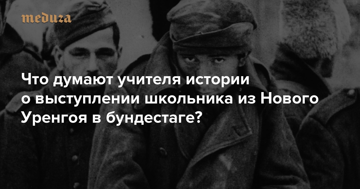 Российский гимназист Николай Десятниченко 19 ноября выступил с речью в бундестаге: он рассказал о солдатах вермахта, которые не хотели воевать с СССР, и призвал отказаться от войн как способа разрешения конфликтов. На фразу школьника о «невинно погибших» немецких военных резко отреагировали в России: на школьника пожаловались в ФСБ и прокуратуру, потребовав проверить его слова на предмет «оправдания нацизма»; свои эфиры этой истории посвятили федеральные телеканалы. В то же время в защиту школьника высказались мэр Нового Уренгоя и пресс-секретарь президента РФ Дмитрий Песков. «Медуза» поговорила о случившемся с российскими учителями истории — а также с директором немецкой гимназии, по обмену с которой Десятниченко оказался в Германии.