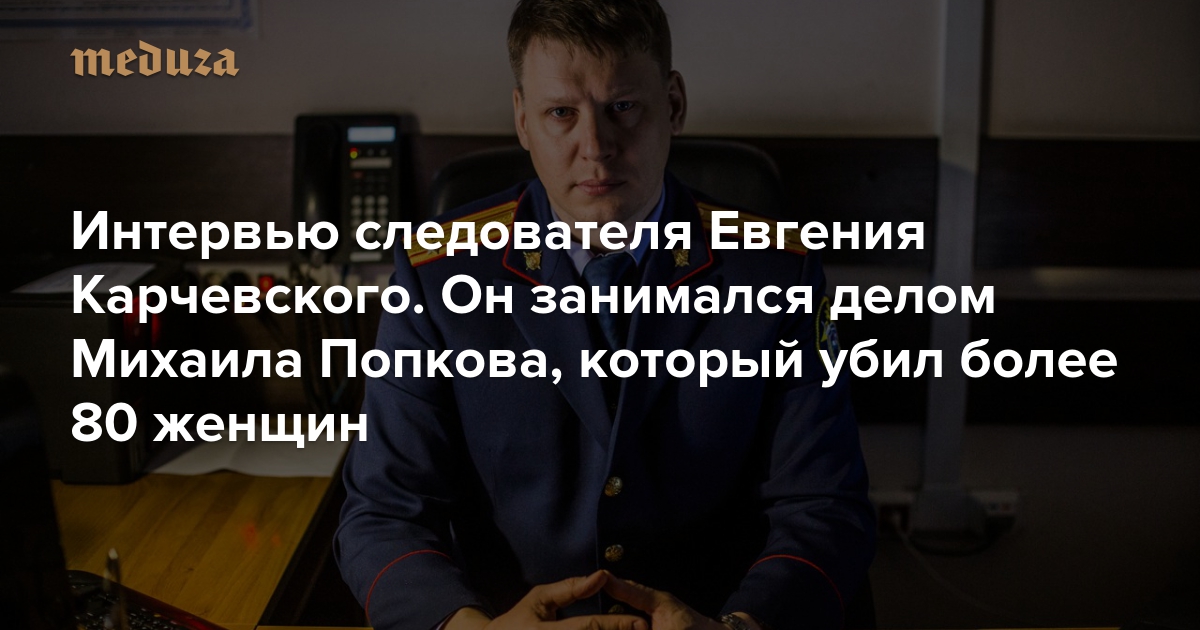 Следователь по особо важным делам следственного управления СК России по Иркутской области Евгений Карчевский подключился к делу Михаила Попкова в 2014-м — два года спустя после того, как «ангарский маньяк» был арестован. Пока в суде доказывали вину Попкова в убийстве 22 женщин и в покушении еще на двух (только за эти преступления в 2015 году Попков получил пожизненный срок), группа Карчевского расследовала и доказала еще 60 эпизодов — 59 убийств и одно покушение. Попков в итоге признался во всех преступлениях, дело передано в Иркутский областной суд. Журналистка «Медузы» Саша Сулим поговорила со следователем Евгением Карчевским.