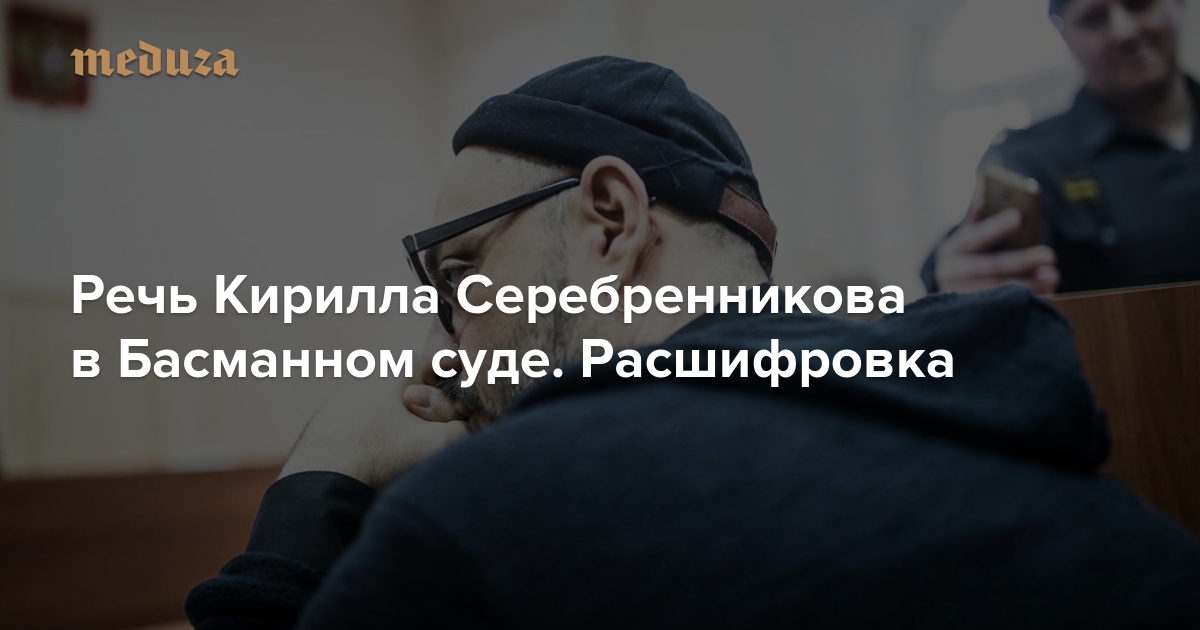 16 января в Басманном суде рассматривается вопрос о продлении ареста бывшим руководителям «Седьмой студии» — Алексею Малобродскому, Юрию Итину и Кириллу Серебренникову. Их обвиняют в хищении бюджетных средств, выделенных на проект «Платформа». «Медуза» публикует расшифровку речи Кирилла Серебренникова, которую художественный руководитель «Гоголь-центра» произнес в суде.