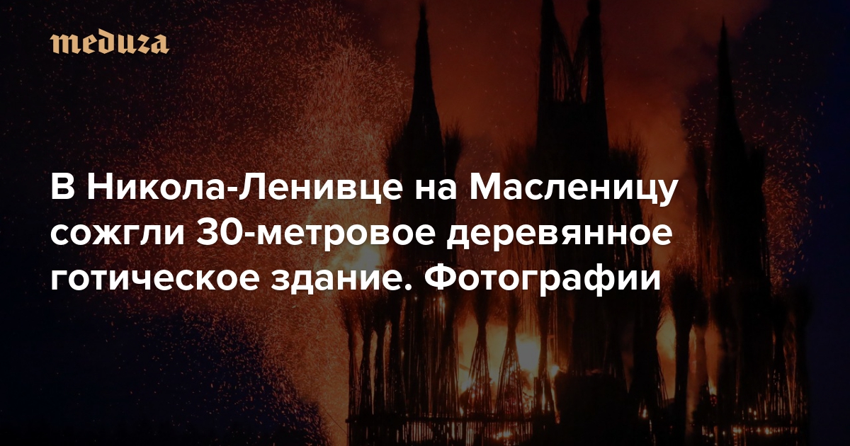 В калужской деревне Никола-Ленивец, вокруг которой разбит большой арт-парк со скульптурами и объектами современного искусства, есть традиция — каждый год по случаю Масленицы здесь строят новый арт-объект, а затем его торжественно сжигают. В этом году жители деревни под руководством художника Николая Полисского, одного из основателей арт-парка, построили «Пламенеющую готику» — 30-метровое готическое здание из веток и деревянного мусора. Сожгли его 17 февраля. «Медуза» показывает, как это было.