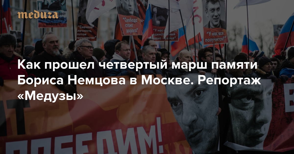 25 февраля в четвертый раз прошел согласованный с московскими властями марш в память об оппозиционном политике Борисе Немцове, который был убит 27 февраля 2015 года на Москворецком мосту. В этом году, по подсчетам «Белого счетчика», в шествии через центр Москвы приняли участие 7,6 тысячи человек — это меньше, чем во все предыдущие годы. За маршем наблюдала корреспондент «Медузы» Ирина Кравцова.