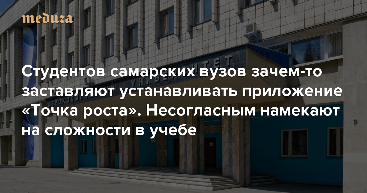 Студенты крупнейших самарских вузов рассказали, что руководство университетов заставляет учеников ставить приложение «Точка роста», разработанное самарскими программистами. Это афиша мероприятий, которые, по мнению разработчиков, должны быть интересны студентам. Приложение предлагает делать чекины на этих мероприятиях, чтобы потом получить приз — поездку в Сочи. Тех, кто не установит приложение, предупреждают о возможных сложностях с учебой.