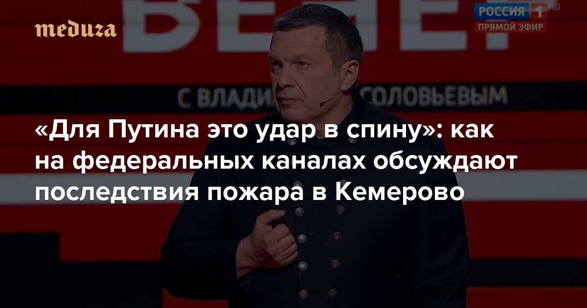 Владимир Соловьев и его гости также обсуждали нарушение нормативов при строительстве и обеспечении пожарной безопасности ТЦ, а само происшествие назвали «массовым убийством по предварительному сговору». Тем не менее в программе особо отметили роль Путина в расследовании причин пожара и попытку оппозиции использовать ситуацию в своих целях. Вот лишь некоторые цитаты.